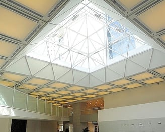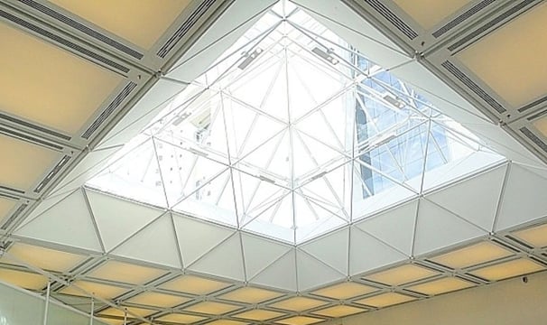 Projeto Fabricação e Montagem das Estruturas Espaciais do Hospital Samaritano Unidade São Paulo. Nesta estrutura, percebe-se a perfeita harmonia entre sistemas de forros, passarelas e painéis de vidros com as barras e nós das estruturas espaciais.